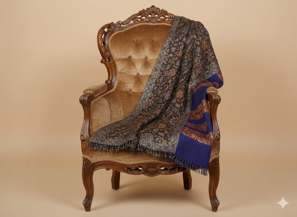 - Product Description - A soft silk-wool blend shawl in rich midnight blue with multicolored paisley detailing, featuring an intricate vintage Jamawar Kani design. Lightweight feel with an elegant drape, adding refined character to both everyday and occasion wear